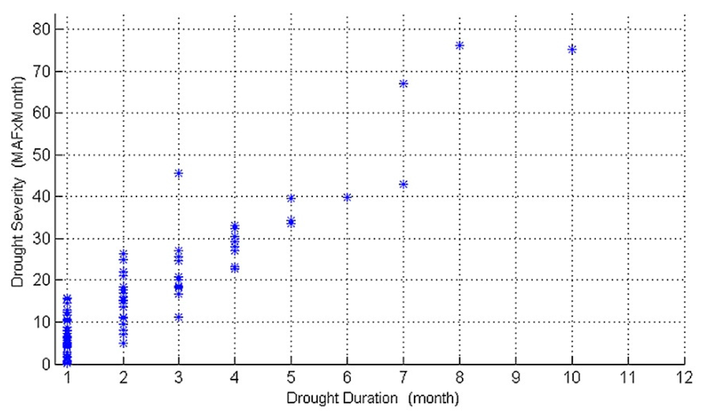 Before drought analysis based on reconstructed streamflow, the truncation level that defines the relevant streamflow level was determined to define hydrological drought from the streamflow series. The median value of annual streamflow, which was 19.4 MAF, was employed as the truncation level to define hydrological droughts for the Sacramento River basin and results are shown in Figure 8. In total, 96 droughts occurred during the period from 1560 to 1977. Their statistical characteristics were: median drought duration of about two years, average drought severity of about 15.8 MAF, and average drought arrival time of about 2.1 years during the 15th to 20th centuries. The longest drought duration estimated was 10 years and had 75.31 MAF during 1927 to 1936 (in the observation period), and the severest drought estimated was 76.17 MAF, which had an eight-year drought duration from 1582 to 1589 (in the reconstruction period).