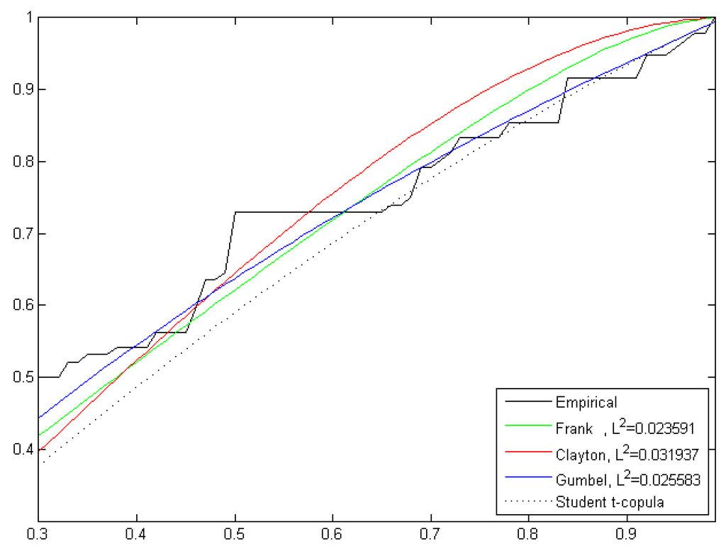 The minimum quadratic distance (L2) between the empirical and theoretical values of the criterion, which describes the most appropriate copula [], was calculated for each copula. As shown in Figure 9, the Frank copula, which generally fitted well throughout (L2 = 0.023), was selected for bivariate drought analysis for the Sacramento River. The Frank copula parameter was estimated as 8.03, and the bivariate joint probability of drought for the Sacramento River basin was described as: