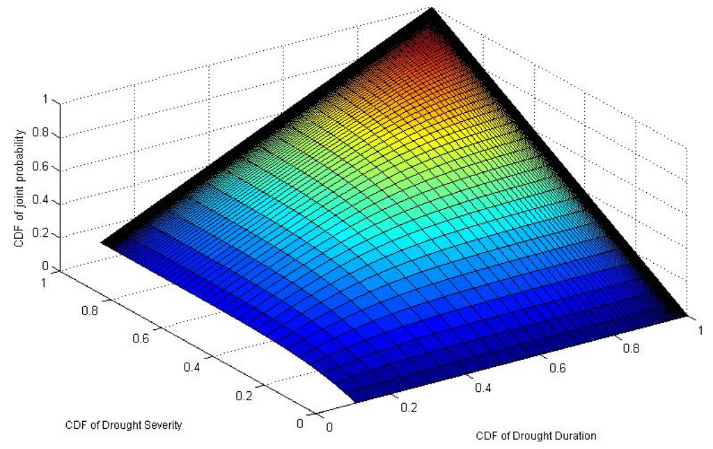 where, and are the cumulative distribution functions of drought duration and severity. Figure 10 shows the joint CDF of the Sacramento River basin drought.
