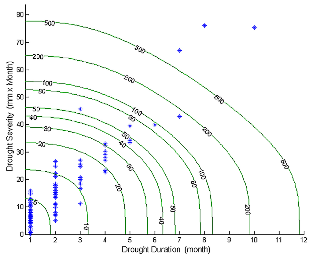 Therefore, the duration and severity of droughts can be expressed in terms of the same return period, which can be illustrated in each “return period plot”, as shown in Figure 11.