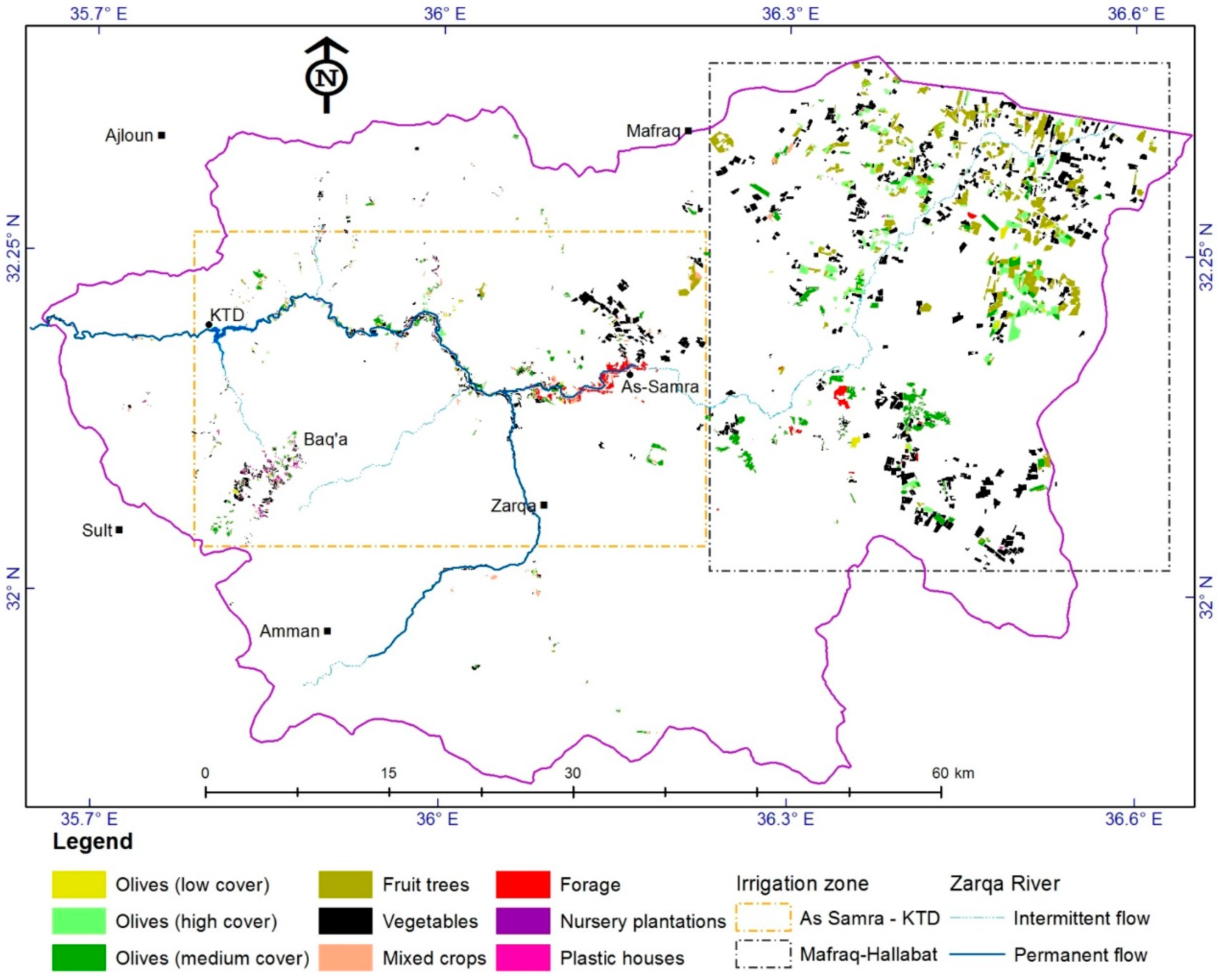 - Al-Bakri, J.T. Crop Mapping for Azraq and Ramtha Areas; A Report for the Advanced on-job Training on the Use of Remote Sensing in Crop Mapping and Evapotranspiration; Ministry of Water and Irrigation: Amman, Jordan, 2014. [CrossRef]