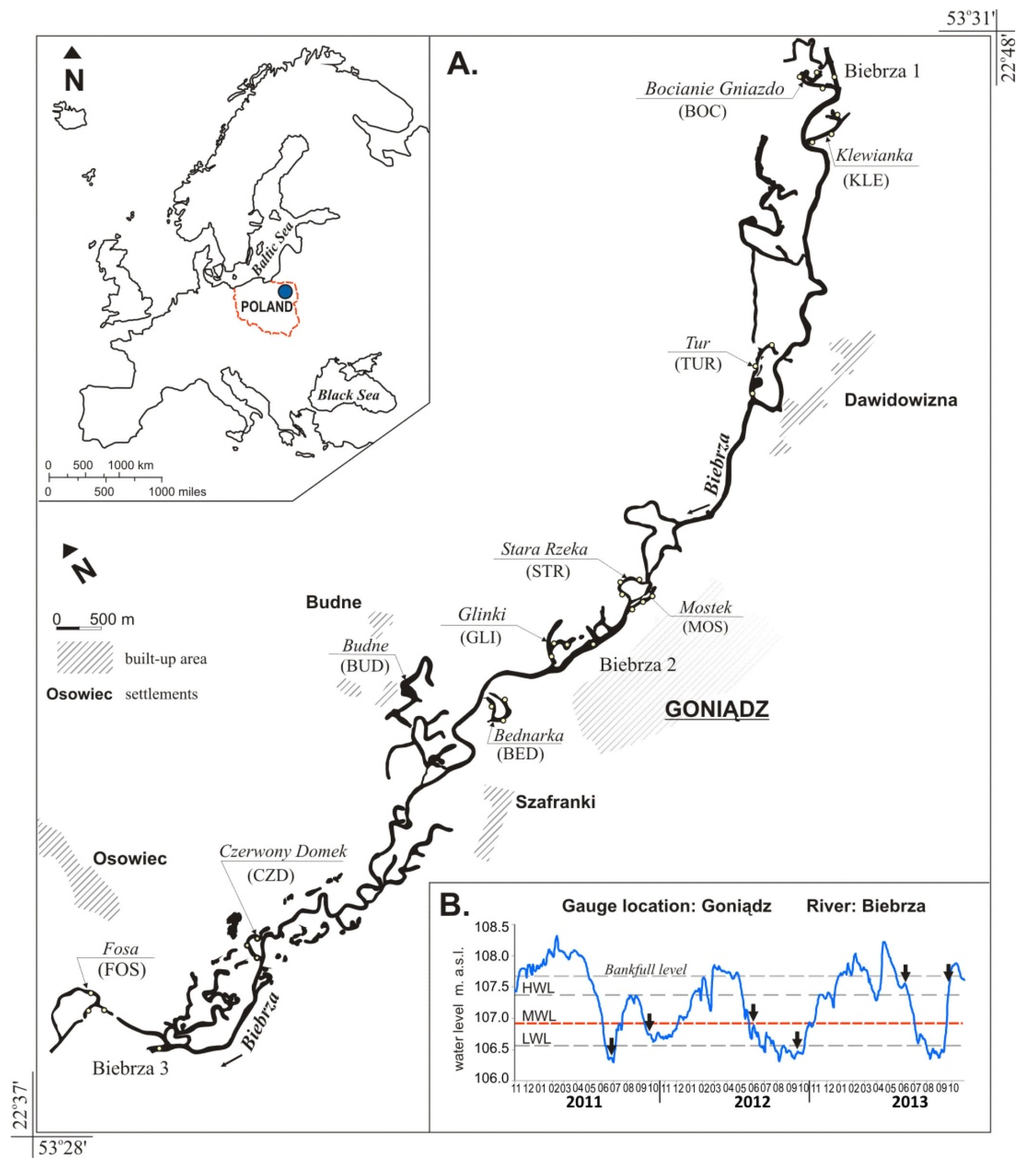 Biebrza is a medium-sized low-gradient river in NE Poland. Its catchment occupies a total area of 7057 km2, and the floodplain covers an area of 1950 km2. The Biebrza River Valley features the Upper, Middle and Lower basins, which have been classified based on differences in their geomorphologic structure [,]. The Middle Basin is approximately 33 km long and spreads along the floodplain between the villages of Sztabin and Osowiec. The river intersects boggy meadows and marshes. Throughout its course, the river forms a large number of old riverbeds and floodplain water bodies in different stages of succession. The catchment was extensively drained in the mid-1970s, but Biebrza's floodplain escaped alteration. In the middle section its natural landscape and flood-pulse pattern have been nearly entirely preserved [,]. Excluding a 10-km-long section, the river is part of the Biebrza National Park, and it is protected under the Ramsar Convention.