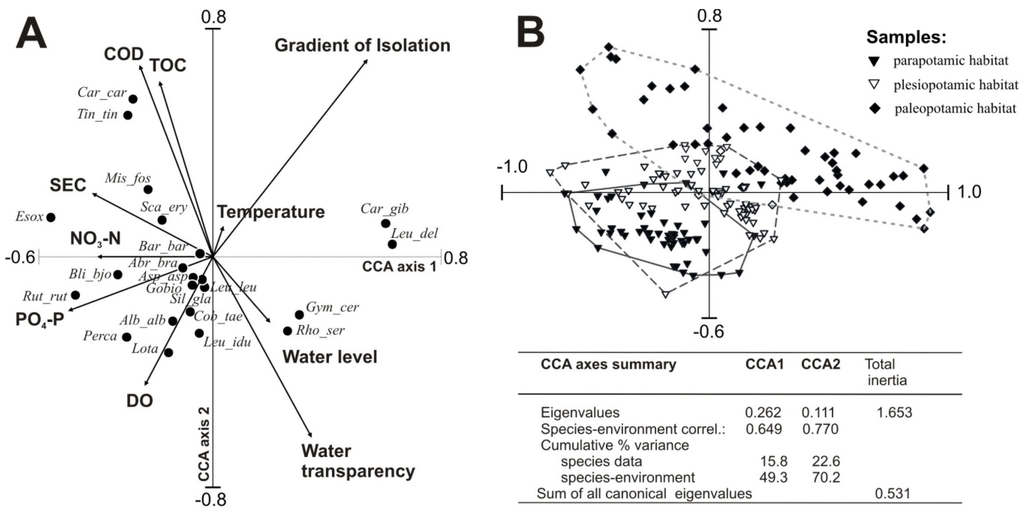 Three types of floodplain lakes (parapotamic, plesiopotamic, and paleopotamic), classified based on hydrological connectivity, differed significantly in physicochemical parameters of water and fish responses to varied habitat conditions. The canonical correspondence analysis (CCA) biplot (Figure 2A) demonstrates the correlations between environmental factors as lateral connectivity, water level, water quality parameters and the abundance of fish fauna in the studied floodplain lakes. The results of the CCA (Figure 2A) showed that eigenvalues of the first (λCC1 = 26.2%) and second (λCC2 = 11.1%) CCA axes accounted for 70.2% of the cumulative variation in the environmental data. The final model accounted for 22.6% of the total variance in fish composition and all canonical axes were significant (Monte Carlo test, p = 0.002).