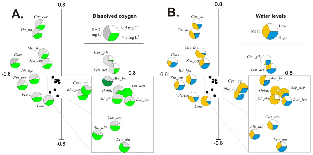 Biplots of CCA with species pies classes distinguished for: (A) water aeration (dissolved oxygen, DO in mg·L−1); and (B) zones of water levels: low; mean and high water. Each pie chart in the figure represents the percentage of individuals of a given species in selected classes of dissolved oxygen and water levels. Rare species were down weighted. For fish abbreviations, see Table 2.