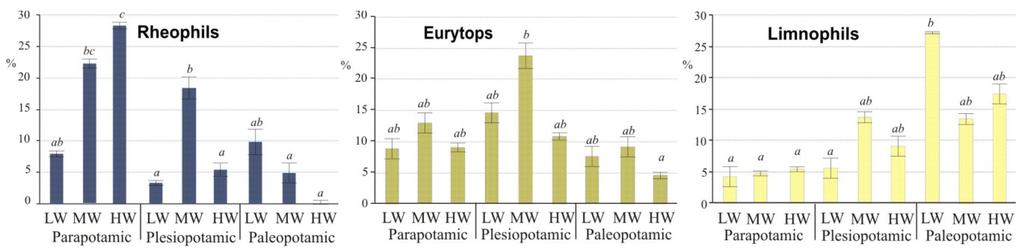 As typical inhabitants of isolated lakes, limnophils differed significantly (ANOVA, post-hoc Duncan’s test, p ≤ 0.05) from other guilds during low water stages (Figure 4). In the group of rheophilic species, the chub predominated at low water (50% of specimens), mainly in lakes of high water exchange. High water (potamophase) did not contribute to an increase in species abundance. Only two species, the ide and asp, adapted to higher water stages, and their share during that period reached 65% and 60%, respectively (Figure 3A). The above taxa contributed the group of rheophils that were characterized by significant differences (ANOVA, post-hoc Duncan’s test, p ≤ 0.05) during high water. Eurytops were more opportunistic and had no water stage preferences, but their share in lentic lakes decreased during floods (Figure 4).