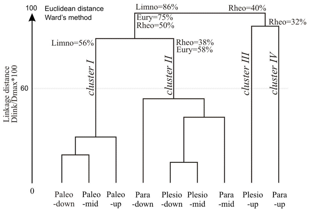 Dendrogram of Hierarchical Cluster Analysis (HCA) for upstream (-up), middle parts (-mid) and downstream arms (-down) of floodplain lakes types based on % of fish abundance data, obtained by using the Ward’s method as linkage rule and Euclidean distance as a metric for distance calculation. Statistically significant clusters when (Dlink/Dmax) · 100 < 60.