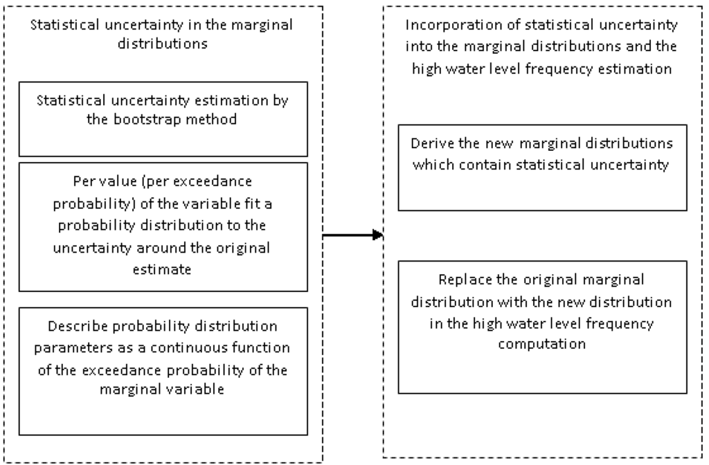 The outline of the method is illustrated in Figure 1. First, the bootstrap method is applied to estimate statistical uncertainty in the marginal distributions. Second, the statistical uncertainty is incorporated into the marginal distributions to form into new marginal distributions. Third, the new marginal distributions are applied to compute the high water level frequency in the Lower Rhine Delta, and to assess the impact of statistical uncertainty on the high water level frequency.