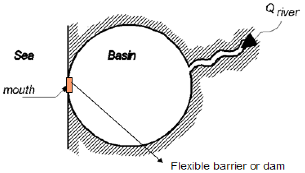 Being a closable delta, there are two states for the Equal Level Curves: the state of open can be described by Equation (A1), the state of closure can be described by Equation (A3). After the closure of the delta, the water level behind the barrier rises because the Rhine flow cannot be discharged into the North Sea and will accumulate. In this process the heights of the surrounding dikes are assumed to be infinite high and no dike breaches occur.
