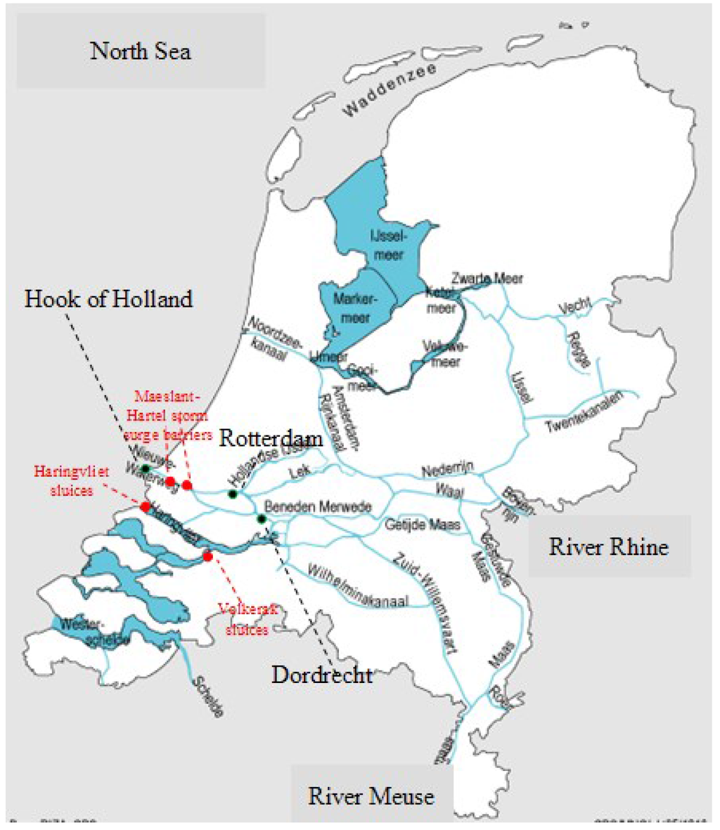 - Zhong, H.; van Overloop, P.J.; van Gelder, P.; Rijcken, T. Influence of a storm surge barrier’s operation on the high water level frequency in the Rhine delta area. Water 2012, 4, 474–493. [Google Scholar] [CrossRef]