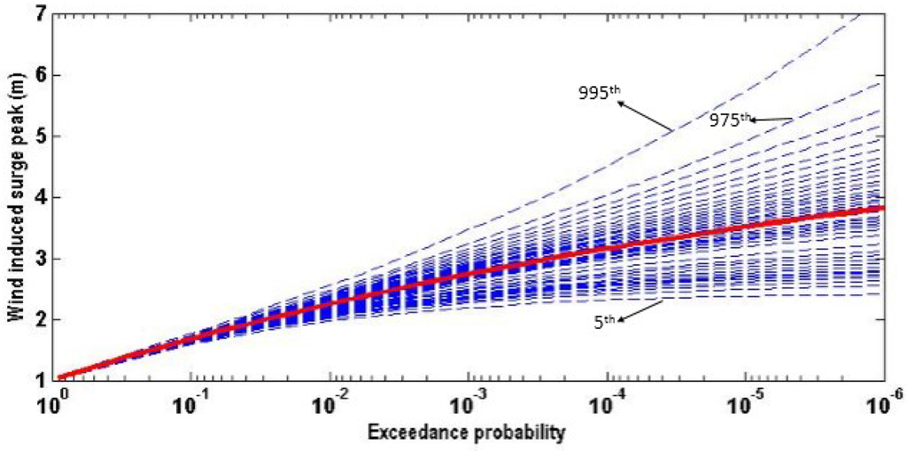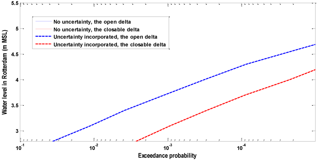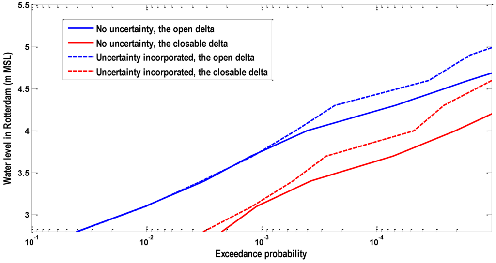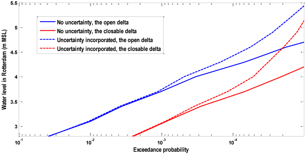 The design water level in Rotterdam is regarded as the water level with an exceedance frequency of 1/10,000; and its present value is 3.60 m above mean sea level (in brief MSL) [25]. As can be seen in Figure 12, the design water level of Rotterdam corresponds to 3.60 m MSL without considering the statistical uncertainty in three marginal distributions, while it corresponds to 3.75 m with considering the statistical uncertainty in three marginal distributions.