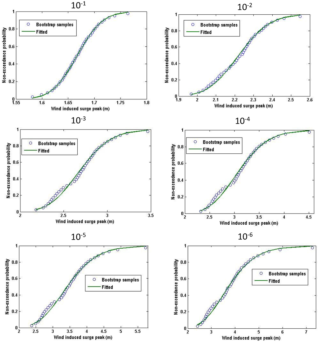The fitted Log-normal distributions at the exceedance probability of 10−1, 10−2, 10−3, 10−4, 10−5, 10−6 of wind induced surge hsmax.