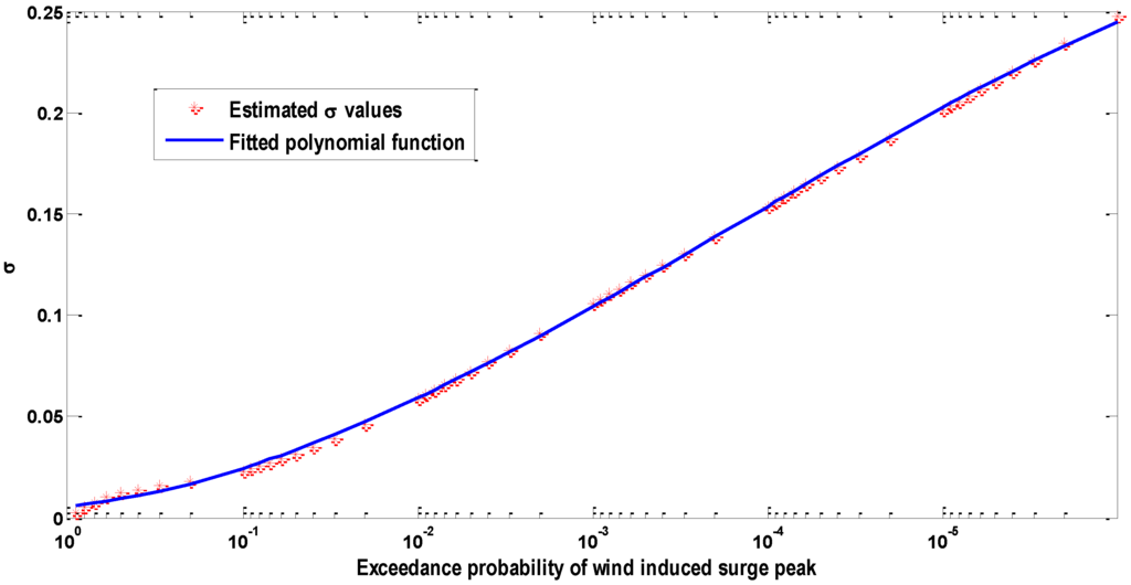 The Log-normal distribution’s parameter σ is modeled as a function of the exceedance probability of the wind induced surge hsmax.