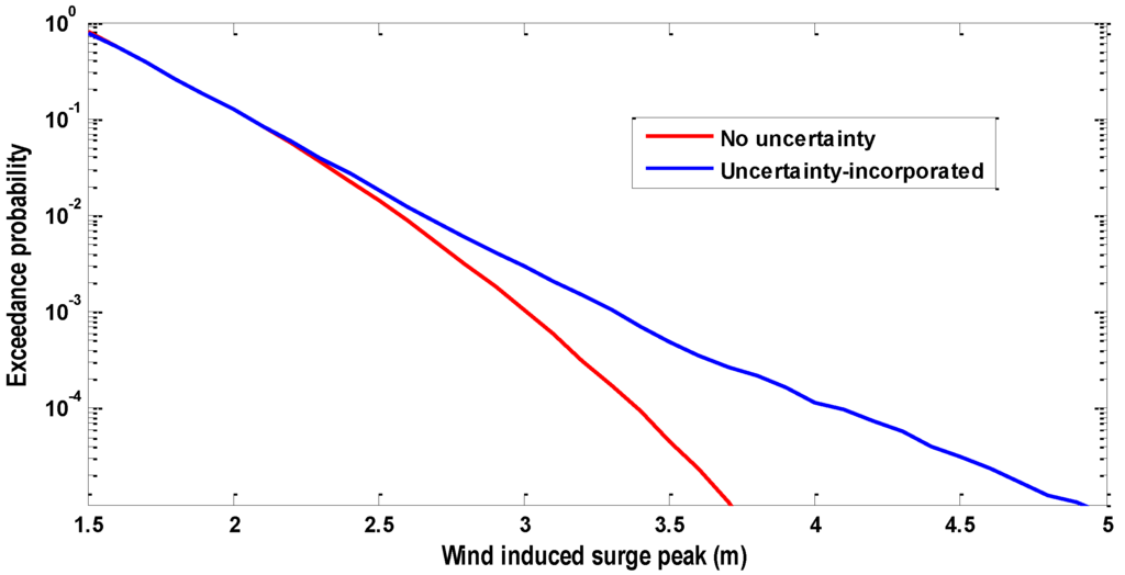 In Figure 11, the high water level frequency curves in Rotterdam are estimated from two different marginal distributions of hsmax respectively. Incorporating the statistical uncertainty in the marginal distribution of hsmax significantly increases the high water level frequency in Rotterdam for the exceedance probabilities lower than 10−3.
