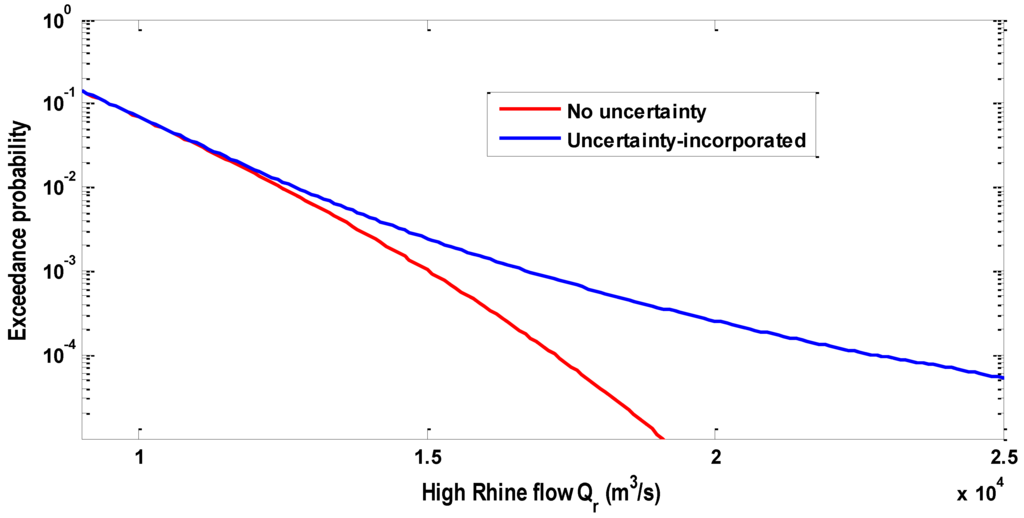 The uncertainty-incorporated marginal distribution of the high Rhine flow Qr.