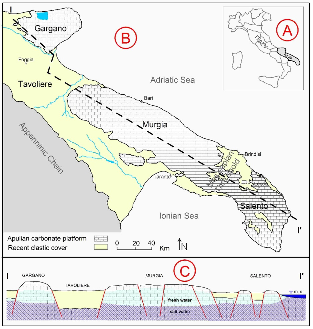 Figure 3. Apulian simplified geological scheme and hydrogeological structures (after [18,19]). (A) Apulia together with the other Italian regions; (B) geological scheme and hydrogeological structure map (light blue is used for surface water); (C) schematic section (note: not to scale; faults are plotted with red lines; fresh and salt groundwater are schematically distinguished by light blue and light violet shading, respectively).