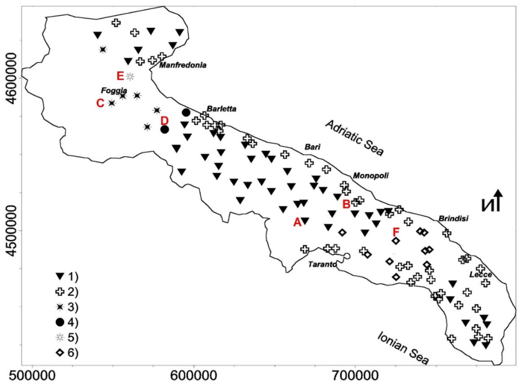 31. Cotecchia, V.; Limoni, P.P.; Polemio, M. Identification of typical chemical and physical conditions in Apulian groundwater (southern Italy) through well multi-parameter logs. In Proceedings of the XXXIX IAH Congress “Hydrogeology and Land Use Management”, Bratislava, Slovenská, 6–10 September 1999; Fendeková, M., Fendek, M., Eds.; pp. 353–358.