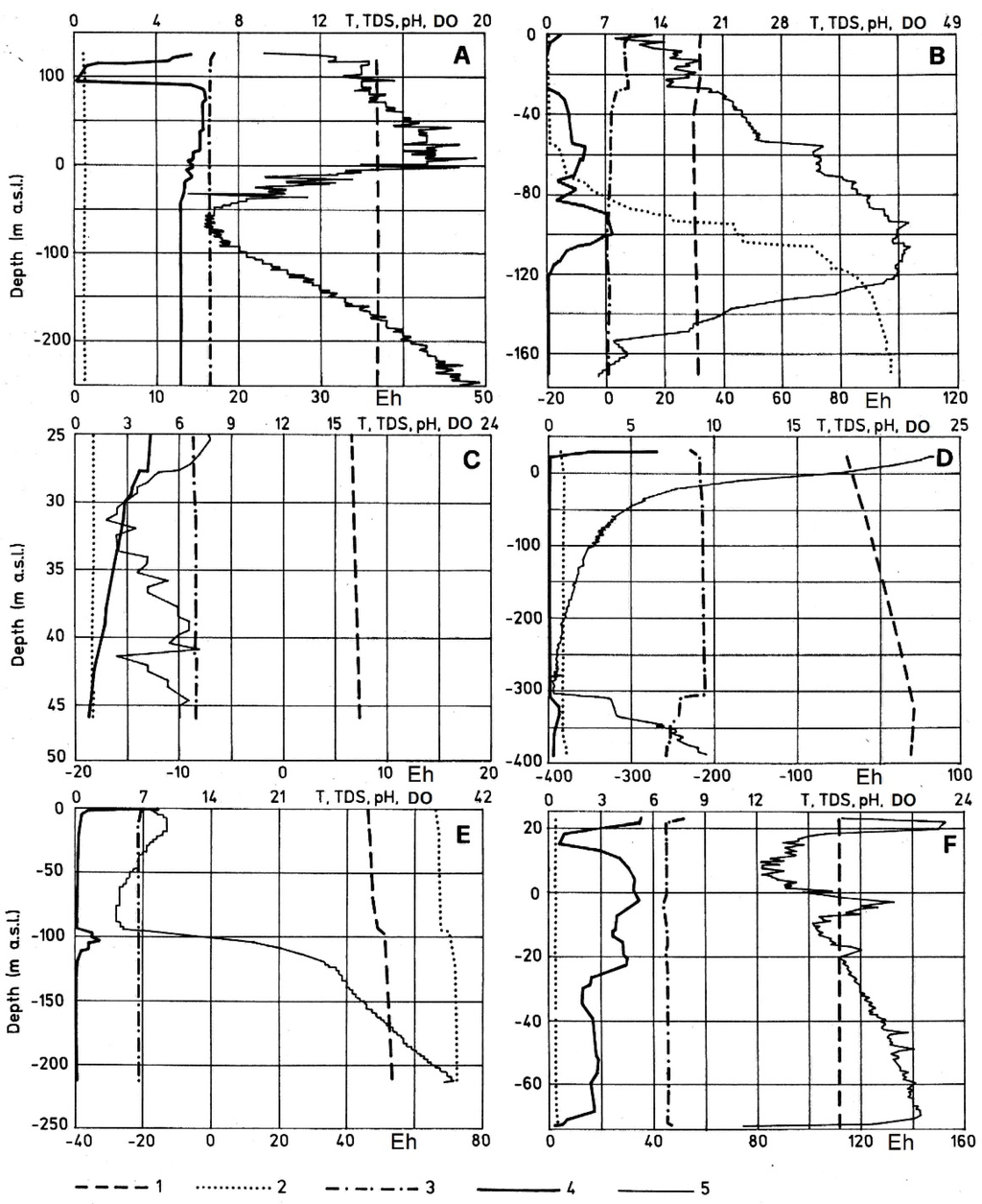 Figure 7. Examples of multi-parameter log types after [31]. Parameters: (1) Temperature (T, °C); (2) TDS (g/L); (3) pH; (4) dissolved oxygen (DO mg/l); and (5) oxidation-reduction potential (Eh, mV). Log type and the selected example well (the well locations are in Figure 6): (A) Inner or recharge area; (B) coastal strip or sea water intrusion area; (C) Tavoliere HS; (D) transition zone between Murgia and Tavoliere HSs; (E) transition zone between Tavoliere and Gargano HSs; and (F) transition zone between Murgia and Salento HSs.