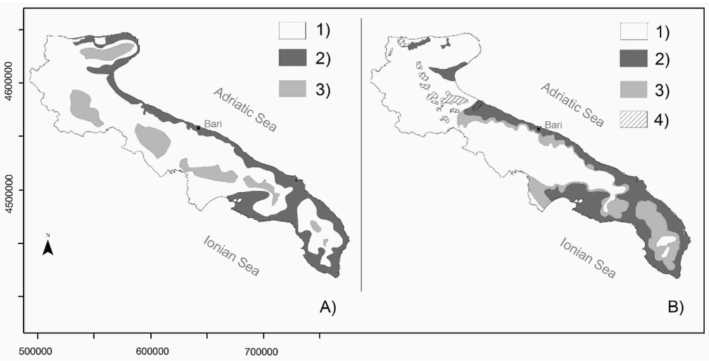 The areas where the water quality was the lowest were located along the coast, as an effect of seawater intrusion. The boring of new abstraction wells was regulated where groundwater quality was suitable for drinking utilization (Figure 8A). This was roughly the case for the main recharge areas of the Apulian aquifers.