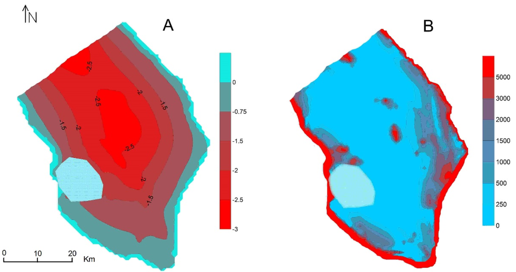 Figure 10. SS-HS piezometric (A, m); and salinity (B, mg/L) maps for a selected layer (layer −50 to −65 masl) for the year 2060, assessed according to the hypothesis of an unchanged discharge level observed at the beginning of the PTA application [33]; piezometric head and salinity increase with respect to natural or steady state values, based on data from the 1930s (after [16]). The light blue area denotes the shallow aquifer.