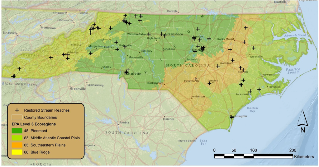 Between 2006 and 2012, aquatic macroinvertebrates were sampled in 79 restored streams across the state as part of a North Carolina (NC) Clean Water Management Trust Fund (CWMTF) effort to assess restored streams []. The selection of streams assessed was a non-randomized sample based on available project documents and data, funding, and physical access. Only restored streams that applied NCD restoration practices [], including modifications to channel and/or floodplain geometry and/or additions of rock and log structures, were included []. Based on a review of grant applications and project documents, many streams were targeted for restoration because of severe bank erosion and channel bed incision, which was considered detrimental to water quality and habitat. As such, stabilizing eroding stream banks and reconnecting the stream to a floodplain were the most commonly identified project goals. Improvement in biological habitat or integrity was also identified as a goal for a small subset of projects. The degree of restoration varied from enhancement (grading of floodplain benches and addition of rock and/or log structures) to complete channel relocation and/or reconfiguration of channel size and shape. The streams are located in a wide range of ecoregions, watershed conditions, bed material size classes, and valley types. Projects ranged in age from new construction to 10 years post-restoration. All sites were visited during March to October. Basic site information and design parameters were obtained for the restoration projects by contacting project designers and funding agencies. A map indicating the location of the 79 sites is provided in (Figure 1).