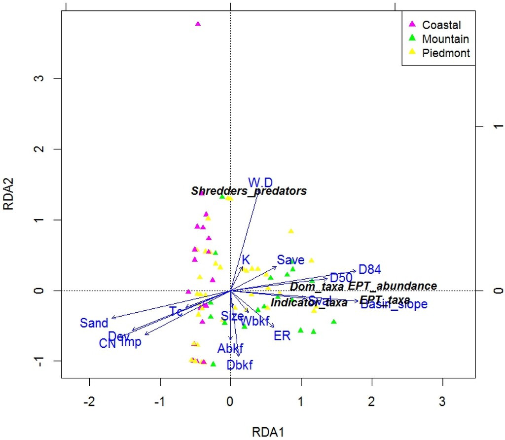 RDA analysis was used to further explore relationships between the macroinvertebrate metrics and the predictor variables (morphology and watershed). Scores from RDA analysis were used to prepare a triplot that simultaneously displays stream scores (based on RDA axes one and two, which explain 66.6% of the variance) as points, macroinvertebrate metric scores as points, and the watershed and morphology variables as arrows (Figure 2). The triplot displays correlation information amongst variables through the angles between the points and arrows. Small angles between two variable arrows imply high positive correlations between these variables, and variable arrows pointing the same direction or species points in the same location reveal intercorrelations of these variables. Arrows pointing in opposite directions are negatively correlated. The triplot reveals redundancies in channel size, slope, and watershed variables. EPT abundance and taxa are closely grouped and dominant taxa and indicator taxa are also closely located to EPT. These four metrics show a strong positive association with slope (basin and valley) and substrate particle size (D50 and D84), and a negative correlation with watershed development variables (percent developed, percent impervious, and CN) and the percent of sand. However, shredders and predators is located separately from the other four metrics and is positively correlated with width-to-depth ratio, [W/d]. The tri-plot is color-coded by physiographic region and reveals a separation between coastal plain and mountain sites. Coastal plain includes both the Middle Atlantic Coastal and Southeastern Plain regions shown in Figure 1. In contrast, the Piedmont streams are more widely dispersed. The plot also displays an outlier coastal plain stream where only amphipods were found, producing a 100% shredders and predators metric score.