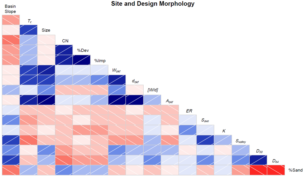 Correlation matrix diagram for 11 landscape and design morphology and six watershed variables. Blue indicates positive and red indicates negative correlation. Darker shades represent higher levels of correlation between variables.