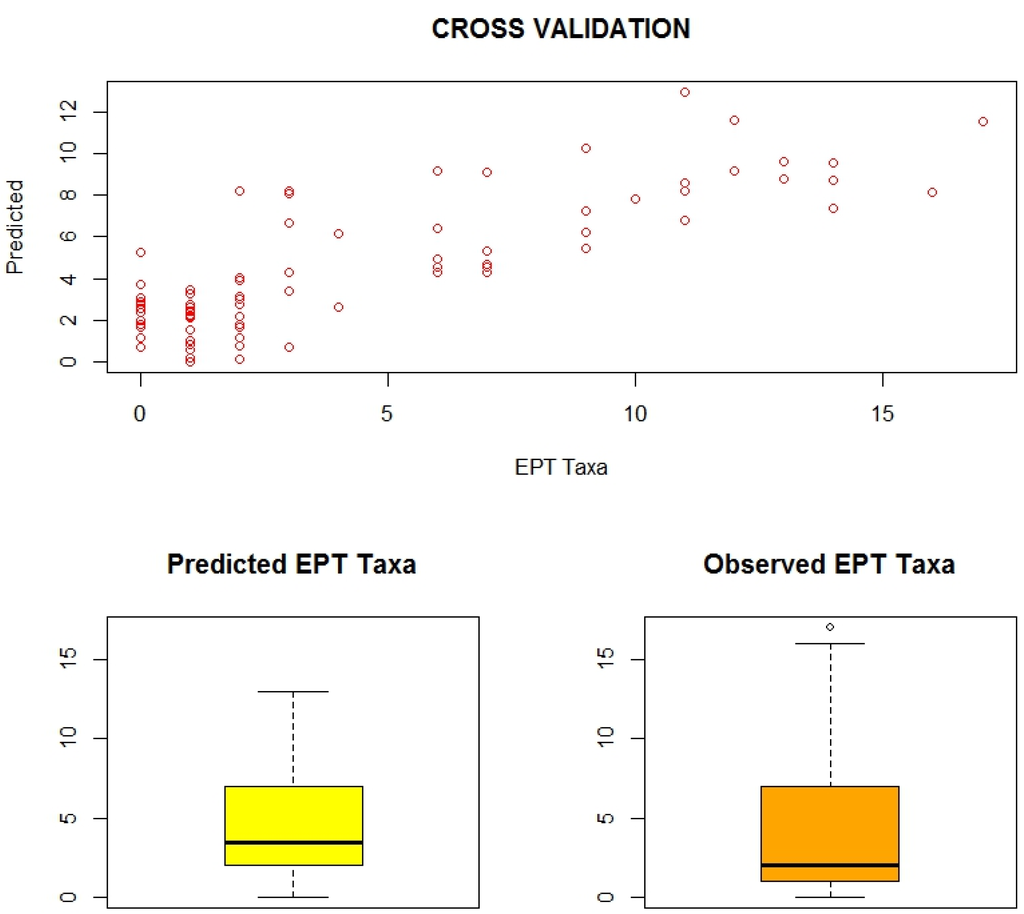 Scatterplot and box plot comparison of predicted number of dominant EPT Taxa resulting from cross-validation of ridge regression model (Predicted EPT Taxa) of six morphology combined with three watershed variables after variable elimination compared with measured (Observed EPT Taxa) number of dominant EPT taxa values for 79 restored streams. Predicted values have been truncated at zero.