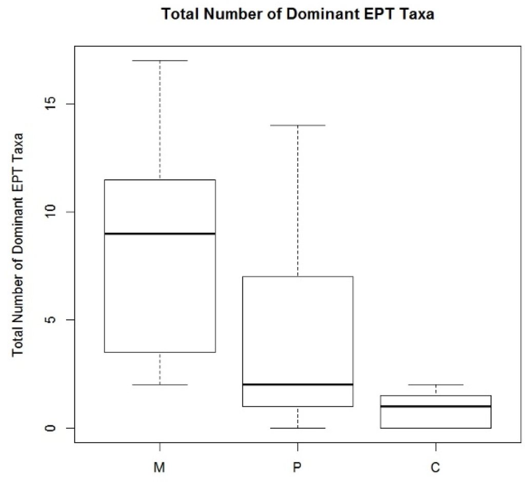 Total Number of Dominant EPT Taxa for mountain (M), Piedmont (P), and coastal plain (C) streams (n = 79).