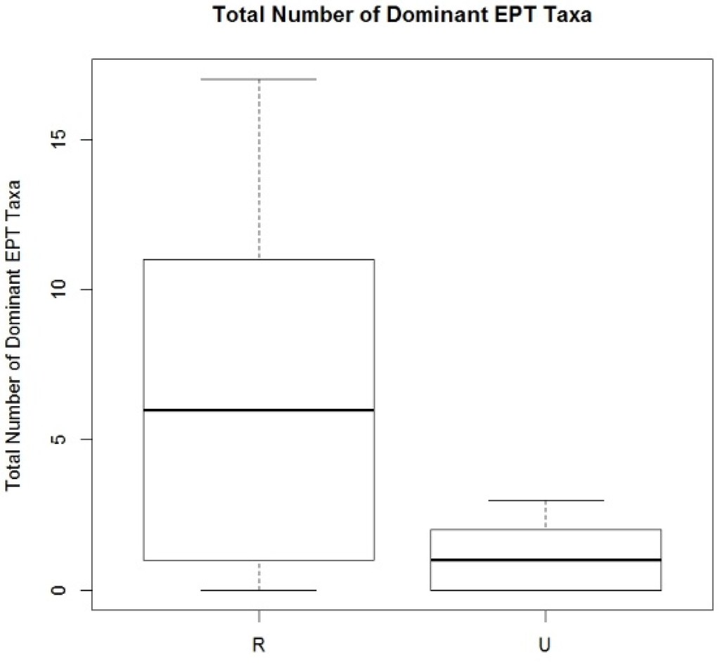 Total Number of Dominant EPT Taxa for urban (% Impervious ≥ 10) vs. rural (% Impervious < 10) Streams (n = 79).