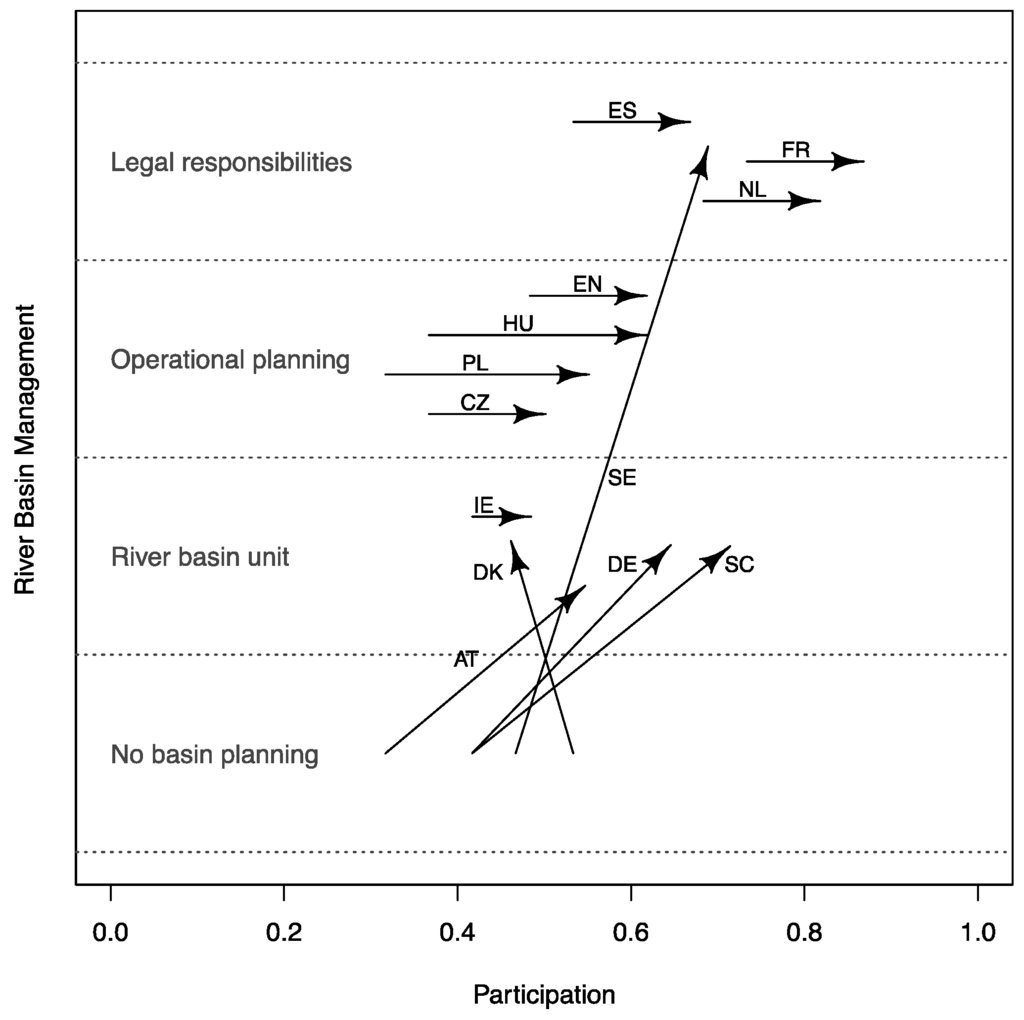 Figure 1 shows, first, that there is a basic tendency for member states to come into compliance with the procedural and institutional requirements of the Directive. All countries that did not employ river basin-scale planning have implemented this—albeit mostly to the legal minimum required (AT, DE, DK, and SC). Significant reforms have, however, been made in Sweden (SE), which has overhauled its water governance regime in terms of institutionalizing river basin management in line with the WFD. Second, all member states except one have increased the intensity of participation in river basin planning (see Table S3 for additional information). Shifts in this respect have varied, but seem to be slightly less pronounced among countries where river basin management is more entrenched (ES, FR, and NL), although it must be noted that these generally had more participatory approaches to begin with. Other countries, which have experienced more substantial increases in participation, began from relatively low starting positions (AT, CZ, DE, HU, PL, and SC). Ireland (IE) is peculiar in that it has only marginally increased participation in the planning process, despite its relatively low starting point, which is mainly due to the wider reforms in water resource management the country undertook in the late 1990s anticipating the WFD. Denmark (DK) is clearly also unique in our sample, in that it has implemented river basin-scale planning, but curtailed participation. This coincides with broader political shifts in Denmark over the period, which saw a narrowing of the scope for participation by civil society and the wider public in government generally [].