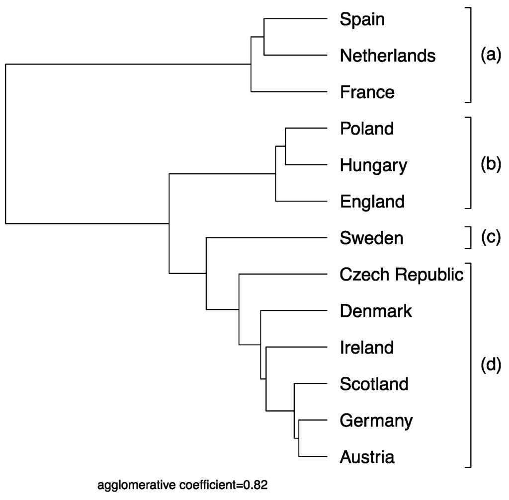 Dendrogram clustering 13 member states on WFD-related governance change. Agglomerative clustering, using nine previously described variables measured for two points in time (see Section 3 and Supplementary Material), Gower’s general dissimilarity coefficient, and Ward’s method of agglomeration.