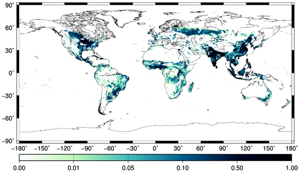 - Ramankutty, N.; Evan, A.; Monfreda, C.; Foley, J.A. Farming the planet: 1. Geographic distribution of global agricultural lands in the year 2000. Glob. Biogeochem. Cycles 2008, 22. [Google Scholar] [CrossRef]