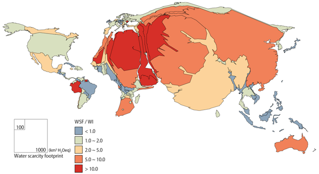 The water scarcity footprint for each country (area size) and the ratio of the water scarcity footprint to the water footprint inventory (colour coded).