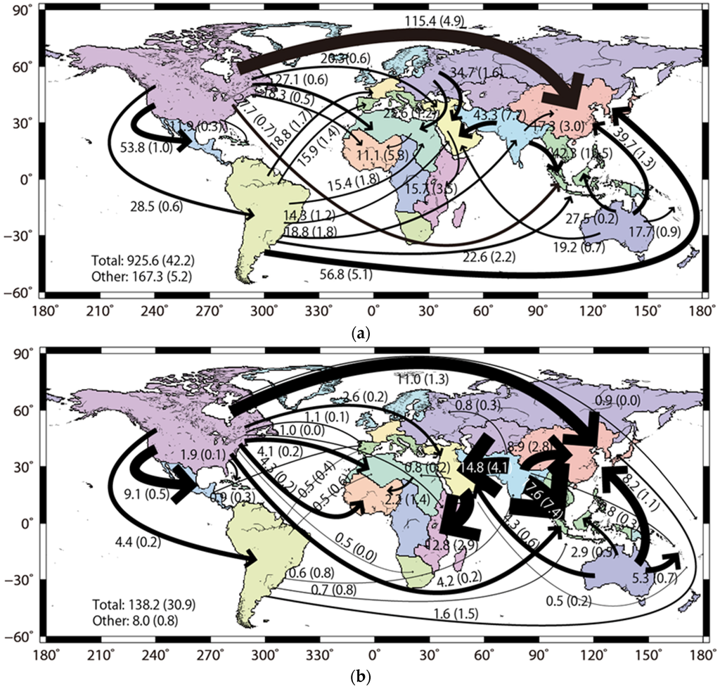 WSF flows from 2010 that were divided by country were aggregated into 22 regions based on a previous study [18]. Figure 3 shows (a) net exports of the WSF for all water sources and (b) irrigated groundwater alone. The “total” value represents the total net flows between the 22 regions, and “other” signifies the total flows below threshold values, i.e., 10 km3 H2Oeq/year for all water sources and 0.5 km3 H2O/year for irrigated groundwater. The numbers shown in parentheses are the standard deviations of the calculated values between the three meteorological forcing datasets. Global total net flows of WI between the 22 regions were calculated at 524.8 km3/year. Previous studies have estimated global gross flows of WI related to crop trades as 695 km3/year for 1995–1999 and global net exports as 355 to 545 km3/year for 2000 [12,21,31]. Although there is not full agreement between the simulation settings (the period, net and gross values, countries, and crops examined in this study), it appears that WI flows were adequately estimated. The WSF flows tended to generate larger arrows than the WI for both types of water sources. The total WSF flows were 1.8 times greater than the total WI flows. WSF water source, precipitation, surface water, and groundwater values were 1.1, 8.2, and 13.8 times greater than the WI values, respectively. In regard to each region, WSF flows for Northern Africa, Eastern Asia, Southern Asia, Western Asia, North America, and Oceania were 15.5, 15.6, 4.9, 11.7, 1.8, and 3.4 times greater than the WI values, respectively. In comparison, WSF flows for the Caribbean, South America, and Northern Europe were 0.6, 0.9, and 0.8 times greater than the WI values, respectively, and in these regions, food production levels were dependent on the presence of abundant water resources. North America, South America, Oceania, and Southern Asia were characterized by net exports of 345.4, 187.8, 118.6, and 109.1 km3 H2Oeq/year, respectively, in 2010. Relative to previous case study results on WSF flows in 2000 [22], the imported value of the WSF for Eastern Asia has been increasing. The imported WSF from North America grew from 88.5 km3 H2Oeq/year in 2000 to 115.4 km3 H2Oeq/year in 2010 and that from South America increased from 12.6 km3 H2Oeq/year in 2000 to 56.8 km3 H2Oeq/year in 2010. This fact is mainly attributed to the growth of the Chinese economy. According to the FAO, the net importing value of crops and livestock products of China increased from 6.5 billion USD in 2000 to 55.4 billion USD in 2010.
