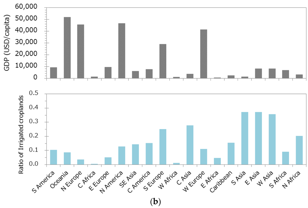 Figure 4 shows the net WI and WSF import levels due to international food trade (exports are negative), the gross domestic product (GDP) per capita [33], and the ratio of irrigated croplands to cumulative croplands for each region. Melanesia, Micronesia, and Polynesia were excluded from the analysis, as these regions generated low proportions. As noted above, South America’s WSF value is smaller than its WI, implying that the region produced food using abundant water resources. In comparison, Oceania and North America generated larger WSFs relative to their WI values. Southern Asia was a net importing region in terms of its WI; however, it was a net exporting region in terms of its WSF. In other words, Southern Asia exports foods produced from scarcer water resources than the water resources used to produce imported foods. GDP per capita values serve as a justification for why Oceania and North America exported foods using scarce water resources. For example, a high GDP creates technological capacities to develop new water resources, to maintain high water-use efficiency levels, and to secure low water use costs due to the presence of competitive industry structures. However, Southern Asia exported food produced from scarce water resources due to the country’s high ratio of irrigated cropland. Southern Asia’s irrigated ratio reached 37%, exceeding values of 10% and 13% for Oceania and North America, respectively. This high ratio resulted in higher water-use efficiency levels, implying that the aggressive use of scarce water resources occurred in Southern Asia.