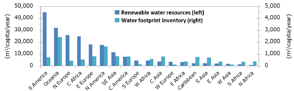 Renewable water resources and water footprint inventory per capita by region.