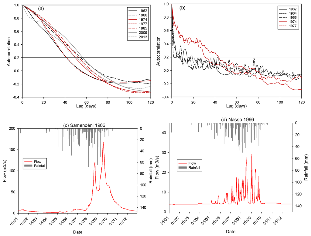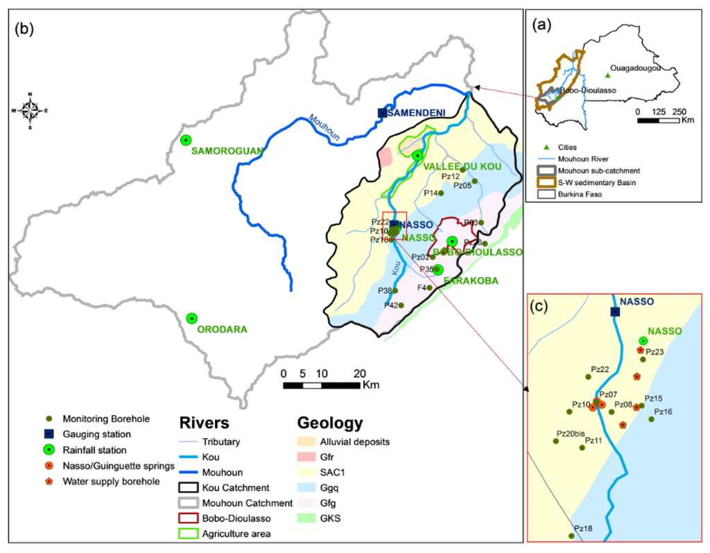 Over the period from 1995 to 2014, the amplitude of seasonal fluctuations ranged from a few centimeters to about 2 m. The highest amplitudes were generally measured in the area close to Bobo-Dioulasso where the altitude is relatively high, and lower amplitudes were measured near the spring area. The variability of the seasonal amplitude reflects the spatial heterogeneity of the groundwater reaction to rainfall (