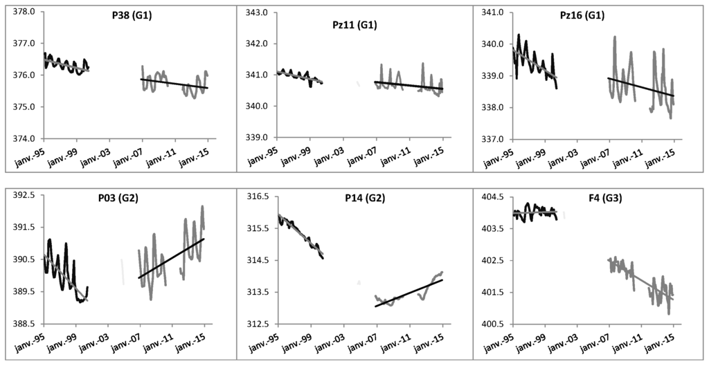 Over the 1995–1999 period, all the piezometers showed a declining groundwater level with a slope ranging from −26 cm/year to −2 cm/year. Only F4 was stable and even showed a slight upward trend of 1 cm/year. After the gap between 2000 and 2006, there is a reduction of the groundwater level slope on all the piezometers. The piezometers were clustered in three groups (G1, G2, and G3) according to their behavior.