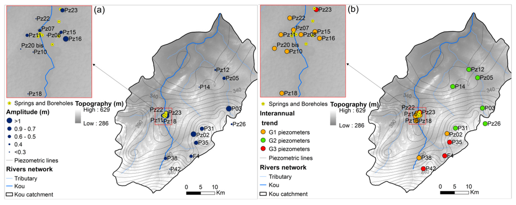 The analysis of the piezometric data revealed that the hydrodynamic response of the catchment’s piezometers varies in space (21 piezometers) and time (11 years, 1995–1999, 2007–2009, 2012–2014). We tested the correlations between various environmental factors to explain these differences.