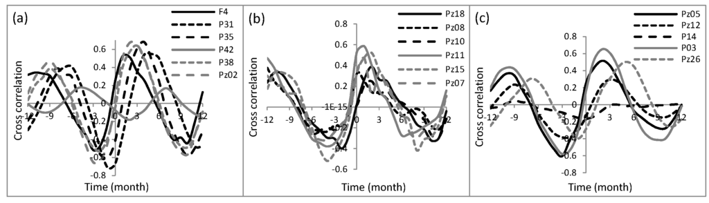 Figure 6 shows the results for the 1995–1997 period. The rainfall-water level relationship did not change significantly between 1995–1997 and 2012–2014 (not shown), except Pz23, where the maximum correlation decreased from 0.7 to 0.3. Since Pz23 was very close to a pumping zone (about 100 m), this decline could be explained by the disruption of the rainfall signal by pumping.