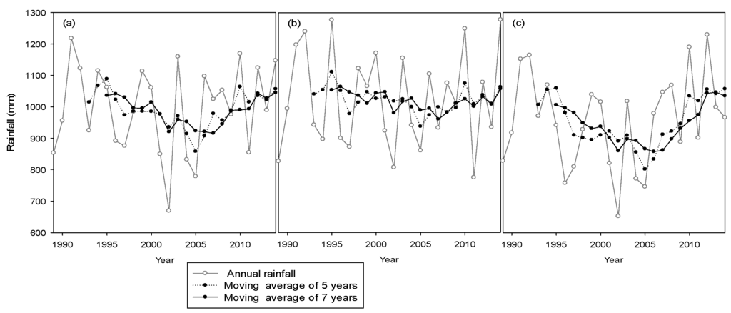 Figure 7). This trend reflects observed changes in groundwater levels. However, the exact date of the shift in groundwater levels is not clear because of the data gaps between 2000 and 2006. The similarity between inter-annual groundwater variation and the moving average of rainfall over several years reflects, in some way, a slow and long-term response of the groundwater. The slow response of underground system has been reported by several authors who argue that the rainfall signal is filtered and lagged through the soil and undergound system [