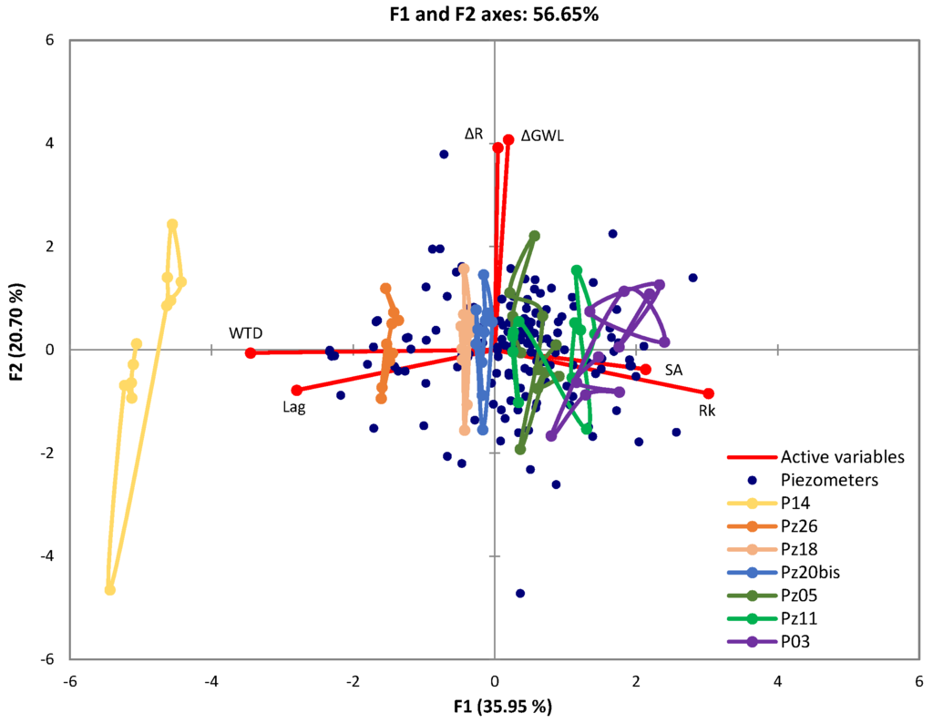 According to these results, rainfall variation explains the temporal variation of the groundwater level on the Y-axis while the spatial variation of the system response is shown on the X-axis. Piezometers are represented globally in two ways. For some of them (e.g., Pz26 or Pz18) with a shallow water table, the individuals are aligned on the Y-axis, showing low sensitivity as regards the spatial response of the underground system (
