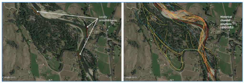 Figure 6. Example of bank armoring that locally precludes maintenance of active channel-migration processes along the Twisp to Carlton reach of the Methow River. Flow is from the upper left to the bottom right of the images; base imagery from Google Earth. Left panel: red lines indicate field-mapped extent of bank armoring; numbers along the channel are river miles. Right panel: air photo-mapped channel centerlines through this reach: blue = 1893, yellow = 1940s, orange = 1960s–1970s, red = 2004, air photo base = 2013. The extent of channel migration has been significantly reduced post-1940s, in large measure from bank armoring. - Riparian vegetation community succession: Enhancement can be accomplished by riparian forest replanting along riverfront properties secured through landowner grants, conservation easements or fee-simple purchase. Benefits are in providing increased inputs of terrestrial insects and organic materials, supporting the long-term recruitment of LWM, increasing riparian shade and improving bank cover along existing channel margins to improve juvenile foraging and cover/holding habitat.