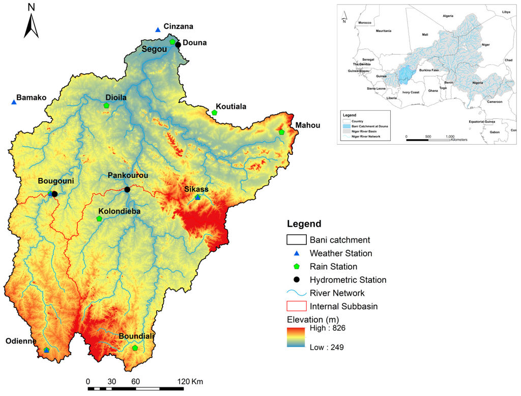 Localization of the Bani catchment at the Douna outlet. The altitude and the monitoring network of the catchment are also given.