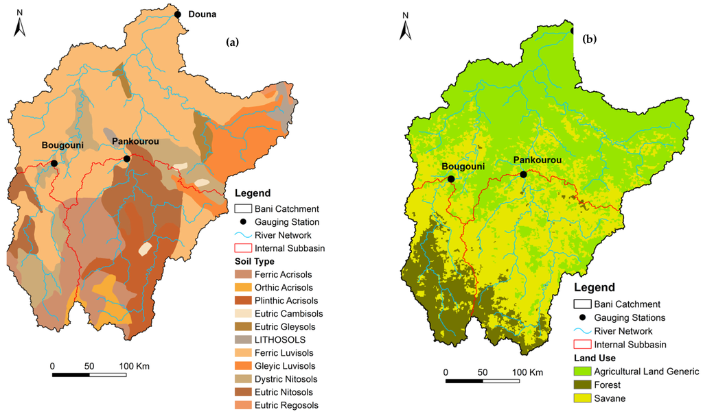 The catchment’s topography (Figure 1) is characterized by a gentle elevation that ranges from 826 m in the South and the center-east to 249 m at the outlet in the North. According to FAO (2003) [28], major soil groups are mainly constituted by Luvisol, Acrisol, and Nitosol (Figure 2a). Based on the USGS Global Land Cover Characterization (GLCC) version 2.0 [29], agricultural land constitutes the dominant land use category followed by savannah and forest (Figure 2b). The Bani catchment is characterized by a Sudano-Sahelian climatic regime. The river flows from south to north along a high rainfall gradient. Annual precipitation varies from 1250 mm at Odienne to 615 mm at Segou (average of the period 1981–2000). The average annual discharge recorded at Douna gauging station between 1981 and 2000 was 184 m3 s−1, which is equivalent to 58 mm of surface runoff depth for an average annual precipitation of 1000 mm. The smallest runoff values were recorded during the years 1983, 1984, and 1987. Due to climate change, there was an abrupt decrease in rainfall in the period 1970–1971 and remained for two decades [27,30] with a more severe impact on water resources. A decrease of more than 60% in discharge at Douna [27,31] and lower contribution of baseflow to the annual flood [32,33] have been reported since the 70s. Concerning future climate change impacts, the Bani basin is projected to experience substantial decrease in rainfall and runoff especially in the long term behavior [27].