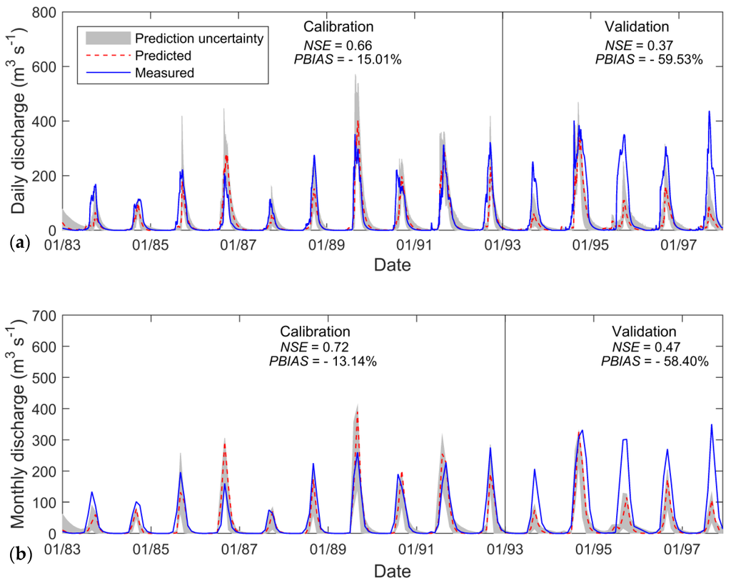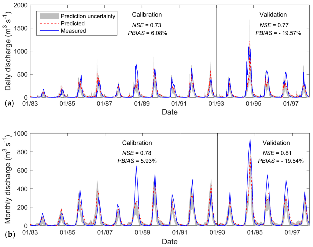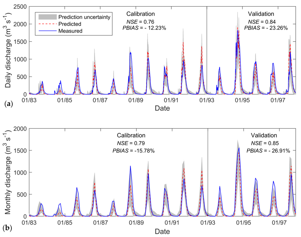 In the present study, model performance, for a monthly time step, will be judged as satisfactory if NSE > 0.50 and PBIAS < ± 25% for discharge [50] and if the graphical analysis reveals a good agreement between predicted and measured hydrographs.