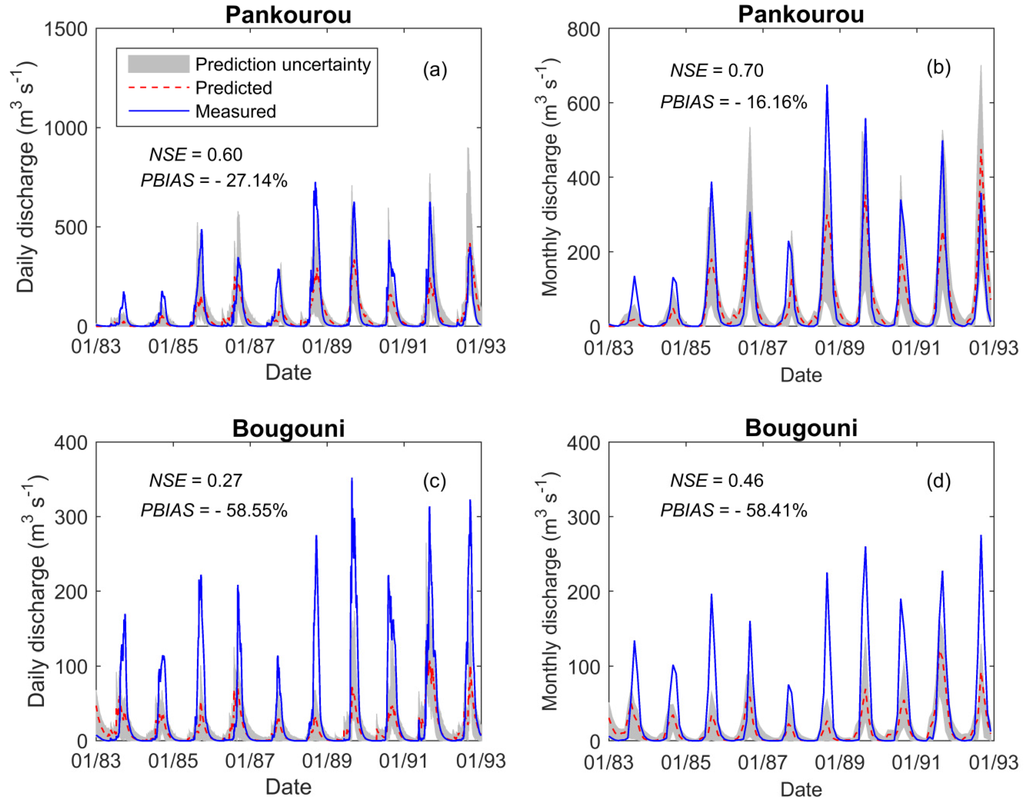 Moreover, an increase of the uncertainty band with increasing time step (daily to monthly) has been recorded as depicted by higher R-factor values at Douna and Pankourou (from 0.59 to 0.65 and from 0.41 to 0.45, respectively). However, the uncertainty band was reduced during the validation period compared to the calibration period for all the stations (Table 6).