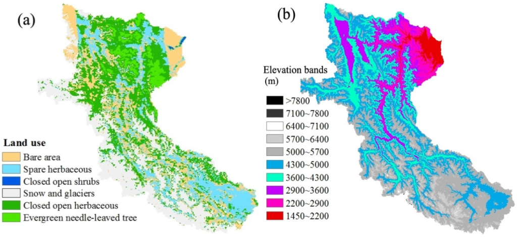 The land use types. (a) In 2005 and elevation bands; (b) in Yarkant River basin.