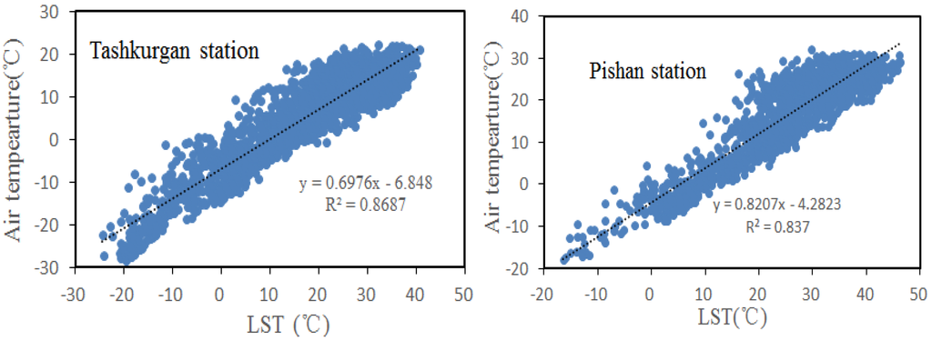 Regression relationship between daily air temperature and LST at the Tashkurgan and Pishan stations in 2000–2009.