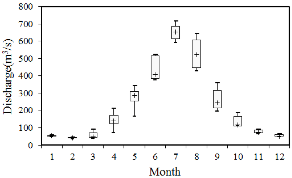 Boxplots of monthly mean discharges at the outlet station derived from eight models from 2003 to 2009.
